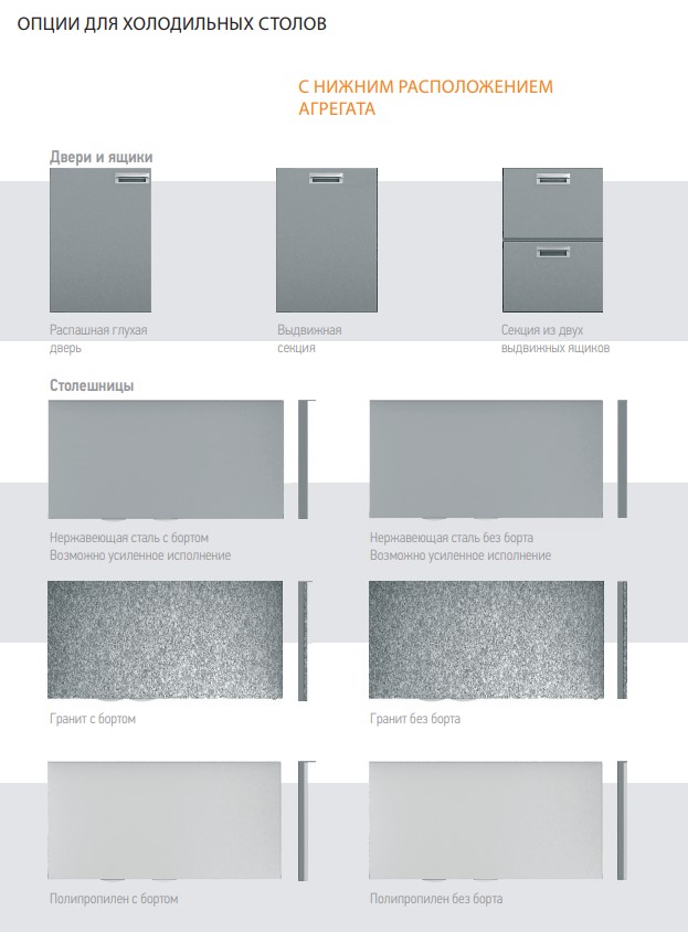 Регулируемые по высоте ножки, автоматические доводчики дверей с фиксатором открытого положения, легкозаменяемые магнитные уплотнители. Толщина столешницы: 50 мм. Высота борта: 50 мм. |