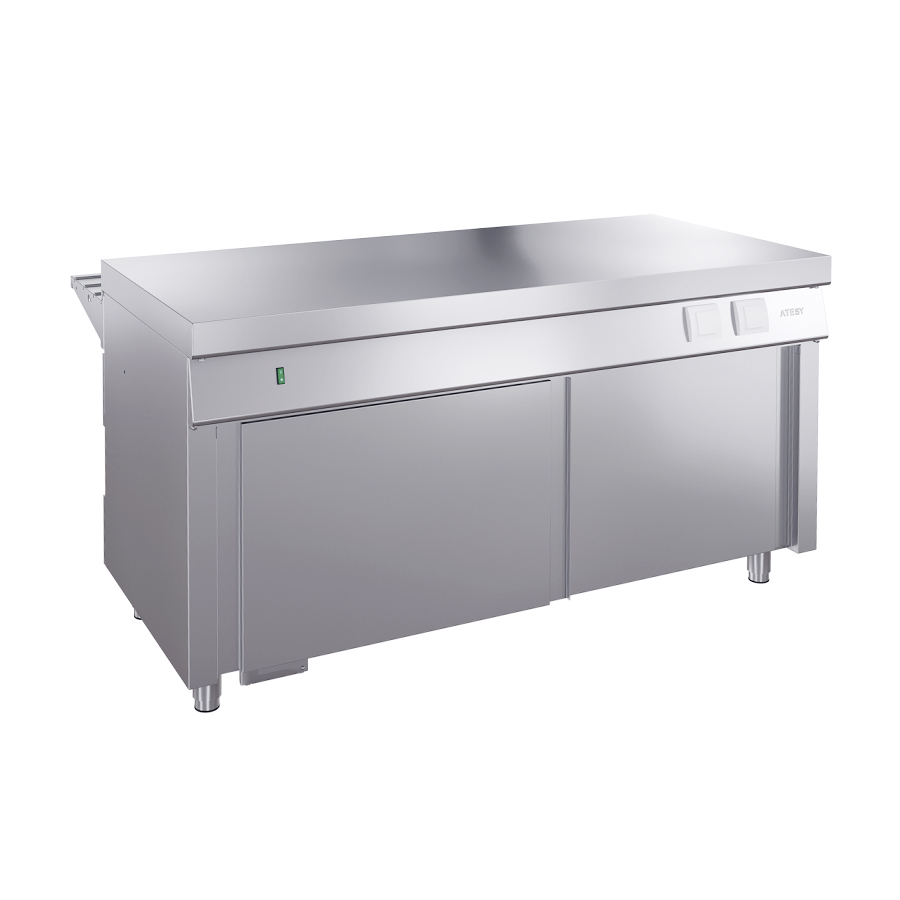 Под столешницей расположена тумба с дверями-«купе» для хранения посуды и инвентаря, тем самым экономя пространство и обеспечивая безопасность в обслуживании.
