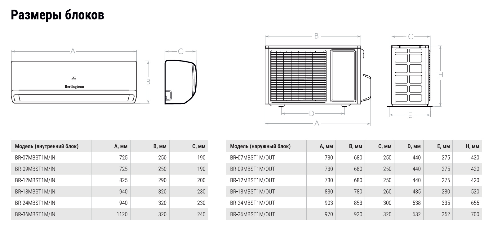 Габаритные размеры внутреннего блока, мм