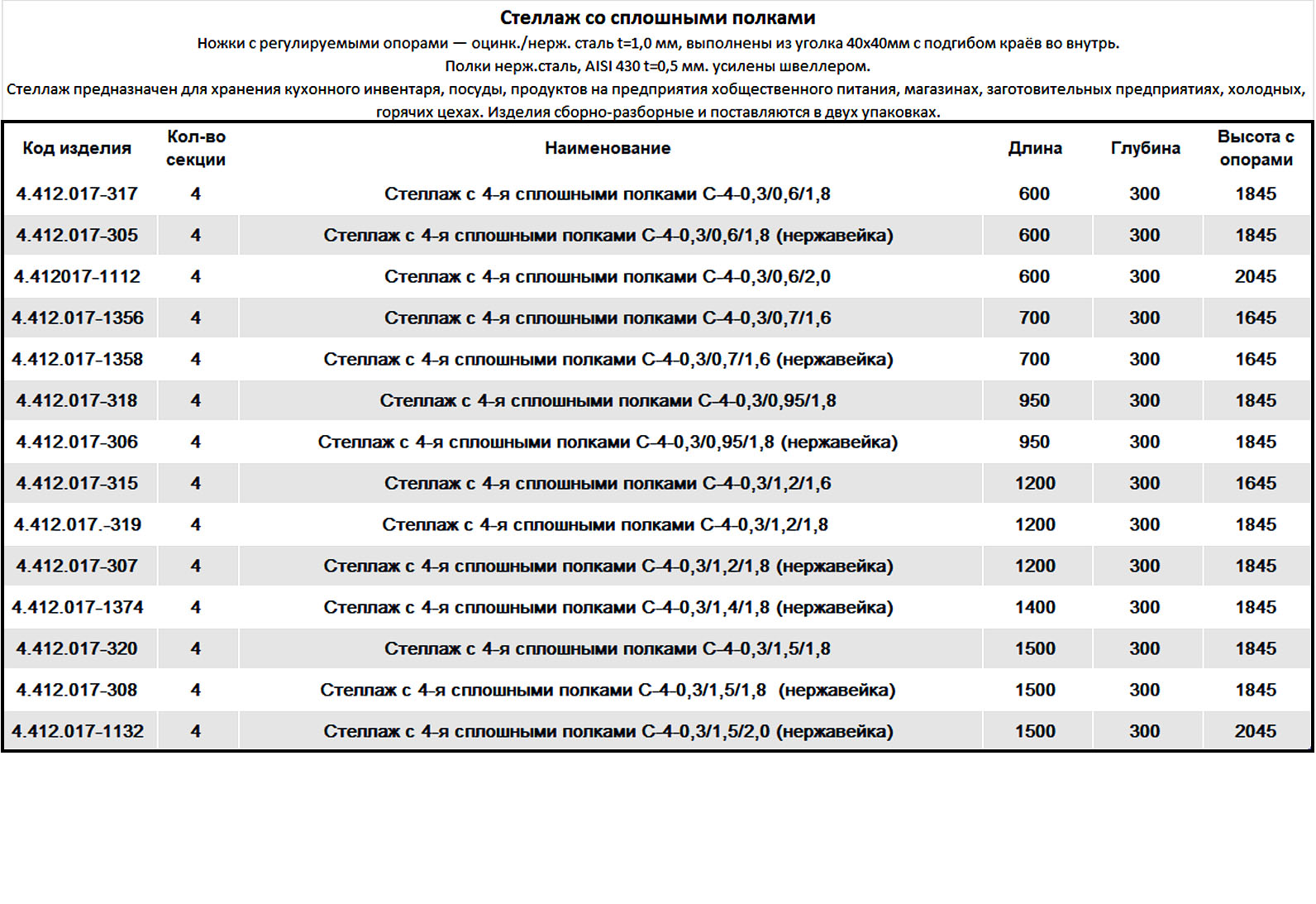 Ножки с регулируемыми опорами - оцинк./нерж. сталь t=0,8/1,0 мм, выполнены из уголка 40х40мм с подгибом краёв во внутрь. Полки нерж.сталь, AISI 430 t=0,5 мм. усилены швеллером. Также поставляются стеллажи со сплошными полками при глубине 300 мм и высоте 1845 мм длиной 600, 800, 950, 1200, 1400, 1500 мм из нерж. стали или оцинкованной стали. |