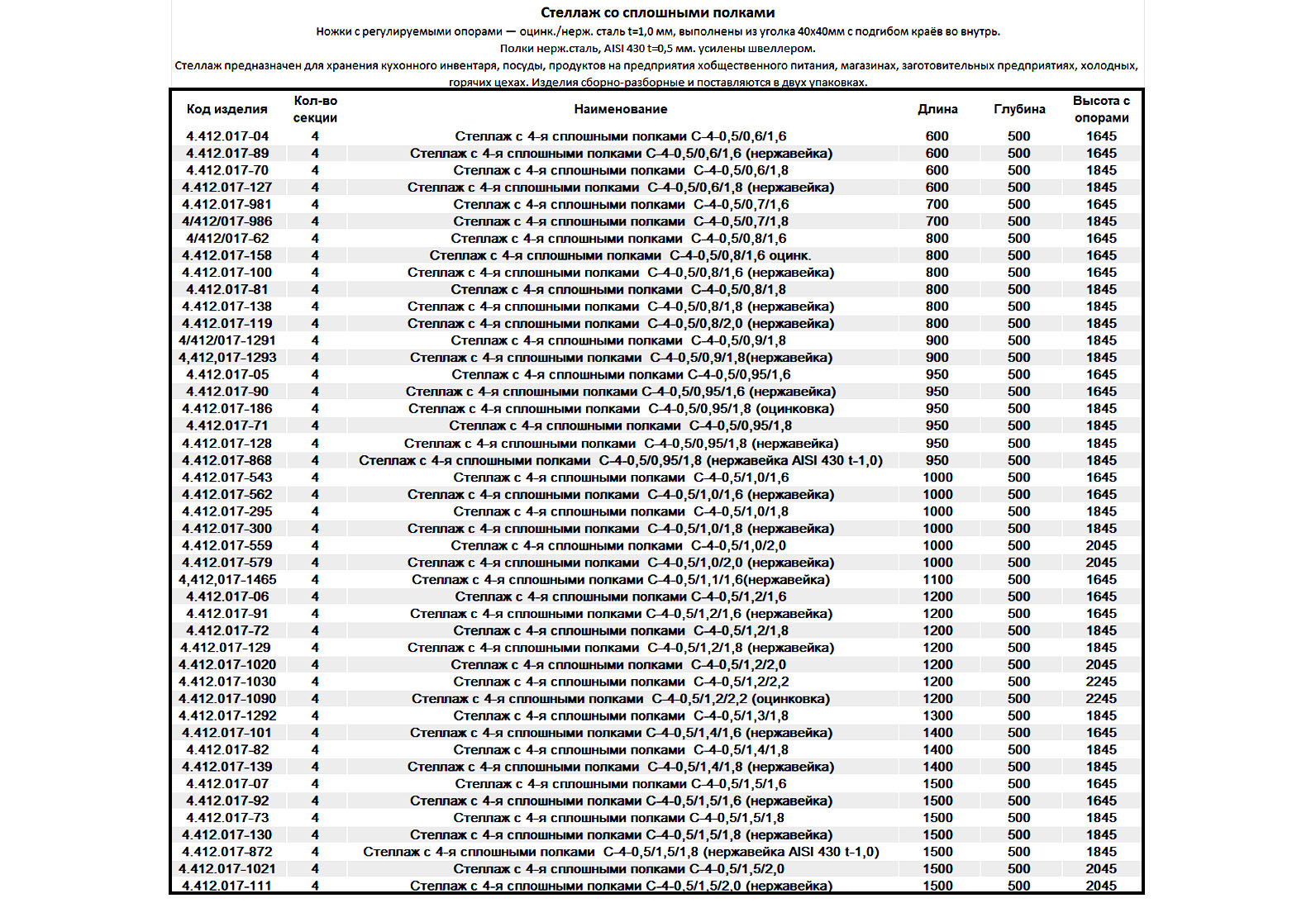 Ножки с регулируемыми опорами - оцинк./нерж. сталь t=0,8/1,0 мм, выполнены из уголка 40х40мм с подгибом краёв во внутрь. Полки нерж.сталь, AISI 430 t=0,5 мм. усилены швеллером. Также поставляются стеллажи со сплошными полками при глубине 500 мм и высоте 1845 мм длиной 600, 700, 800, 900, 950, 1000, 1100, 1200, 1300, 1400, 1500 мм из нерж. стали или оцинкованной стали. |